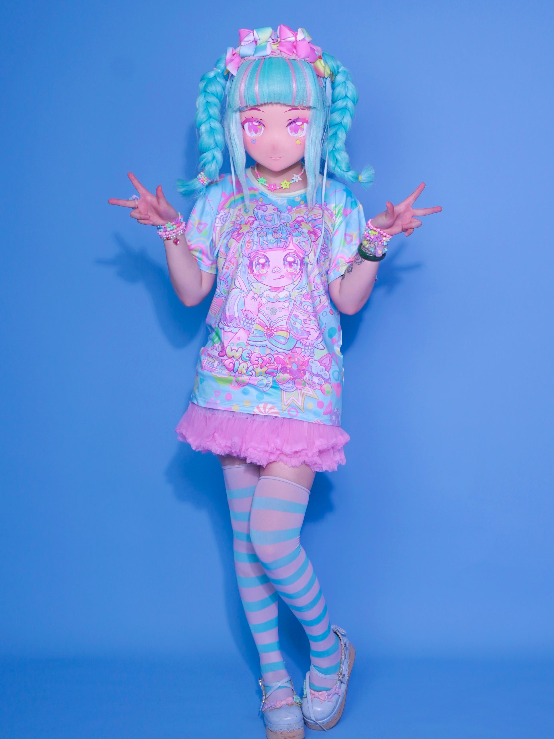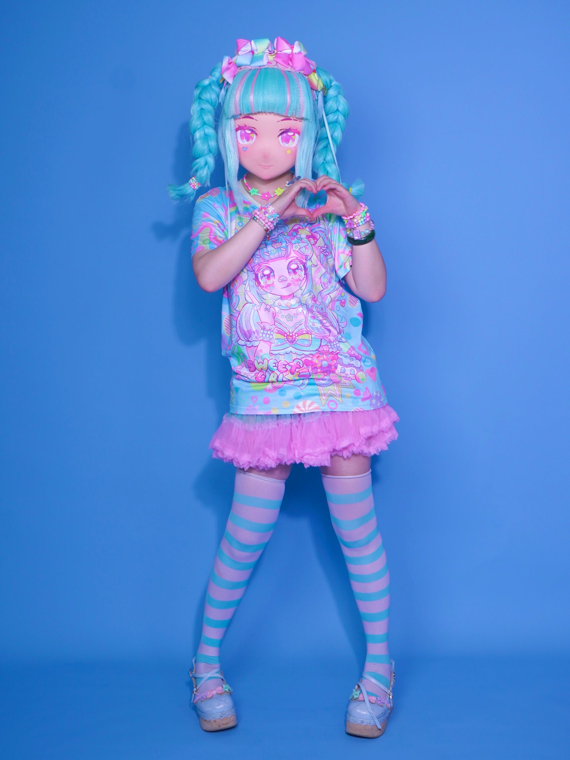 The blue candy girl keeps you cool in the summer. Super sweet decora makeup with full details. Holding a blue bear dessert cup. There are also blue and yellow cake stripes on the cuffs.